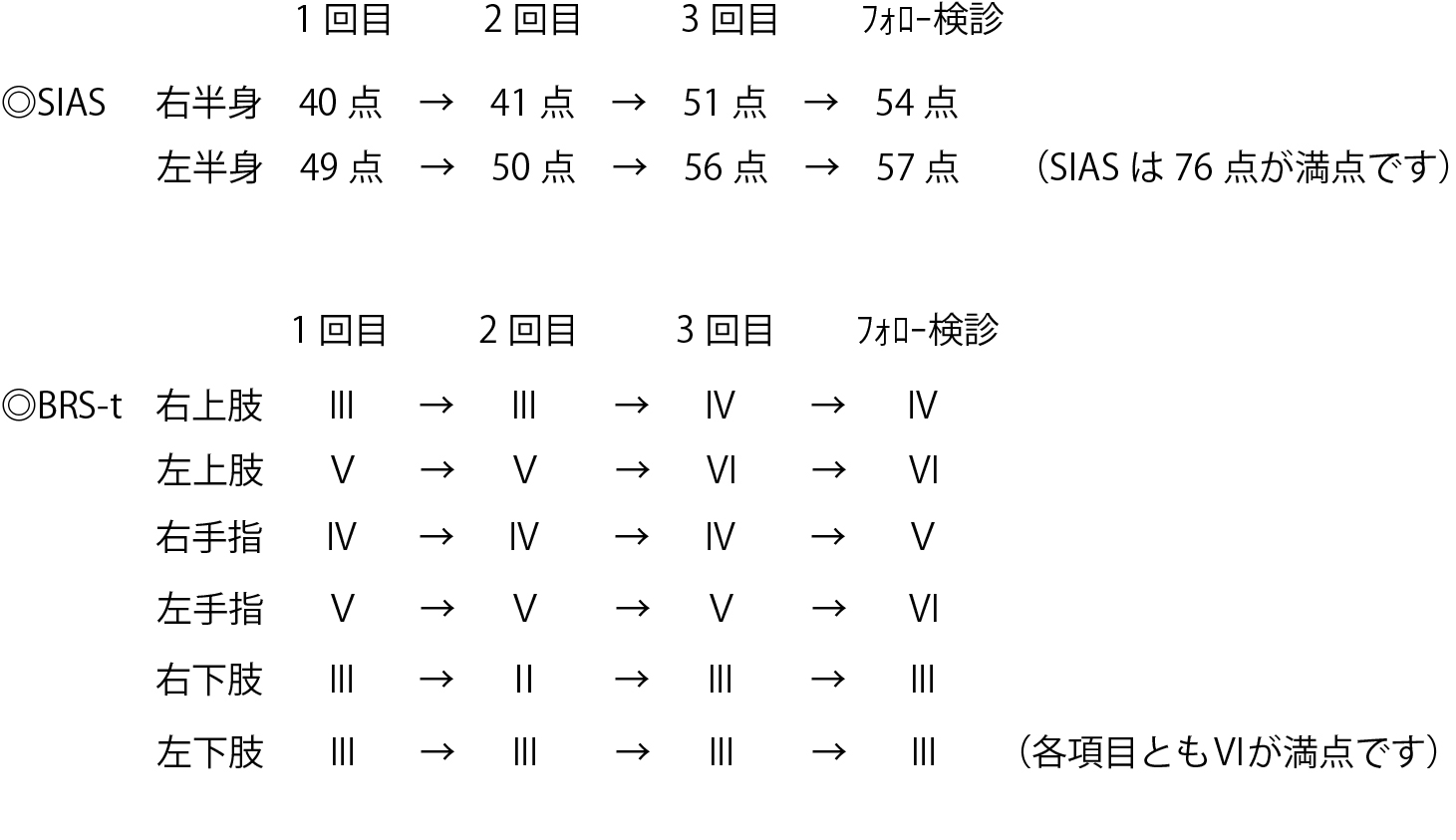 また、運動麻痺の程度を表したBrunnstrom Recovery Stage test(BRS-t)という評価法もあります。どちらも点数が高いほど機能が良いということになりますが、ご本人さまは以下の経過で良くなられました。