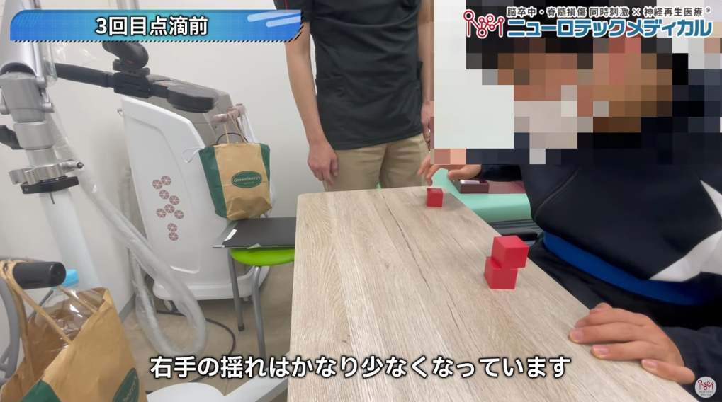 今回、再生医療とリハビリを行っていただいたことで右上肢・手指の運動性が良くなり、何かモノを操作するときの揺れ(運動失調)も軽減してきました。しかし、左手で字を書いていたり、お箸も右手で使うことができなかったりと、細かなことを行えるようになるにはもう一段階の上肢機能が必要になると思います。今後、意識しながらも力を抜いて右上肢・手指を使用していくことで細かな操作が行える上肢機能を再獲得できるようになっていただけると期待しております。