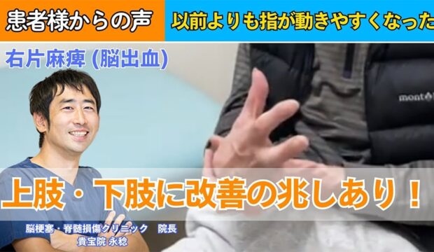 - 上肢の動きは運動麻痺・運動失調ともに軽減しました。特に左上肢はほぼ正常に近い状態にまで改善されました。右上肢には運動麻痺や運動失調は残存していますが、力を抜いて滑らかに動かせるようになってきました。