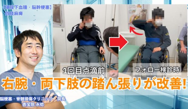 投与前は腕が軽く曲がる程度でしたが、治療後はまだスムーズに動かすことは難しくぎこちなさは残るものの、手が口元に届くまで改善いたしました。