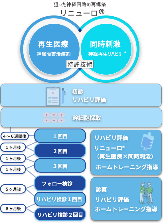 リニューロ®は、損傷した神経回路や失われた神経機能の回復・強化を促す特許技術を活用した神経障害治療です。